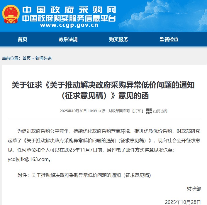 財(cái)政部就《關(guān)于推動(dòng)解決政府采購(gòu)異常低價(jià)問(wèn)題的通知(征求意見(jiàn)稿)》向社會(huì)公開(kāi)征求意見(jiàn)